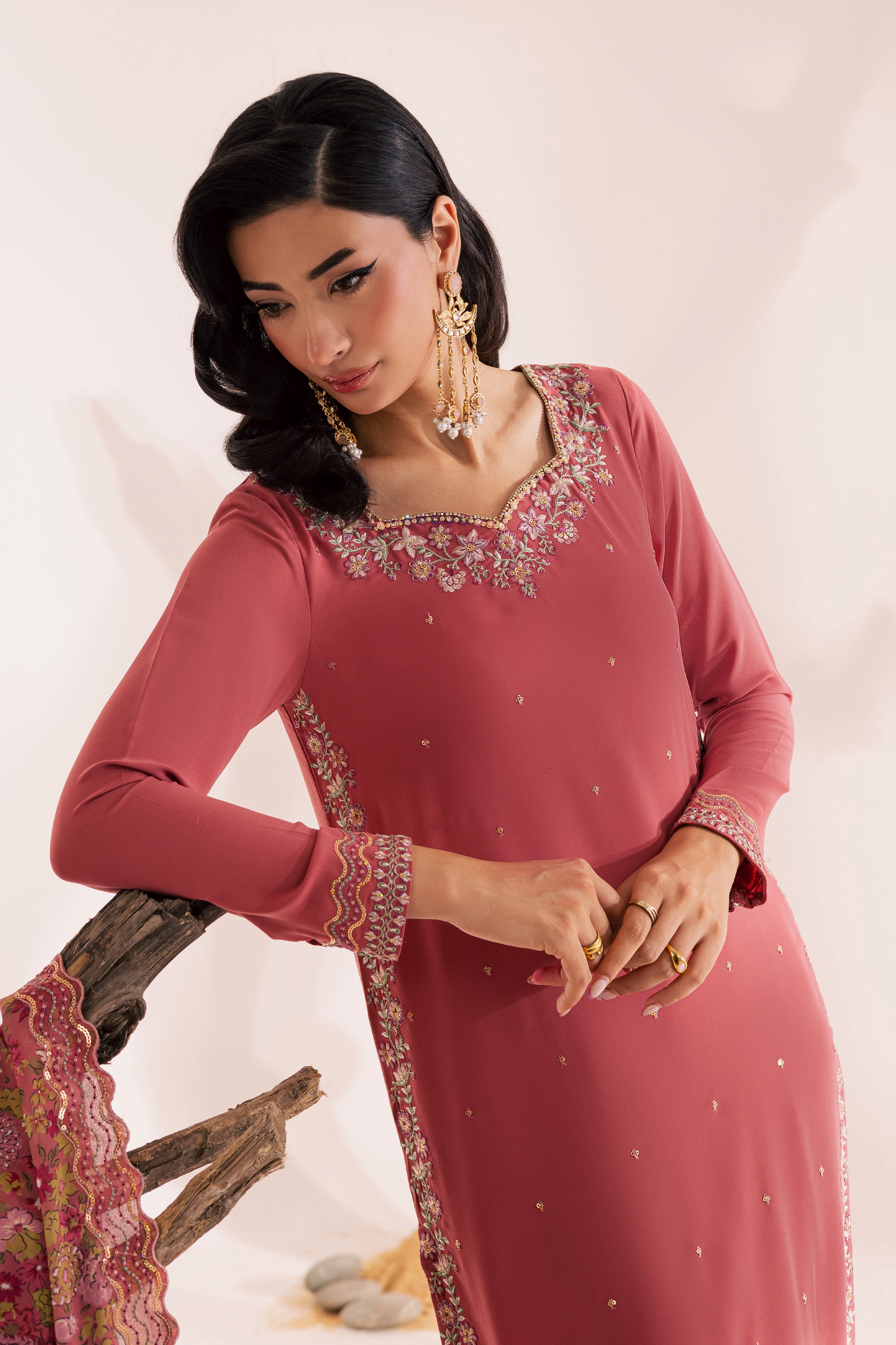 This formal embroidered dress consists of a long georgette rose pink shirt featuring embroidered side panels and a graceful sweetheart neckline, further enhanced with delicate hand embellishments for a refined touch. The fitted sleeves are finished with a 1.5-inch organza border, adding subtle elegance to the silhouette. This formal embroidered dress is perfect for upcoming festive events.