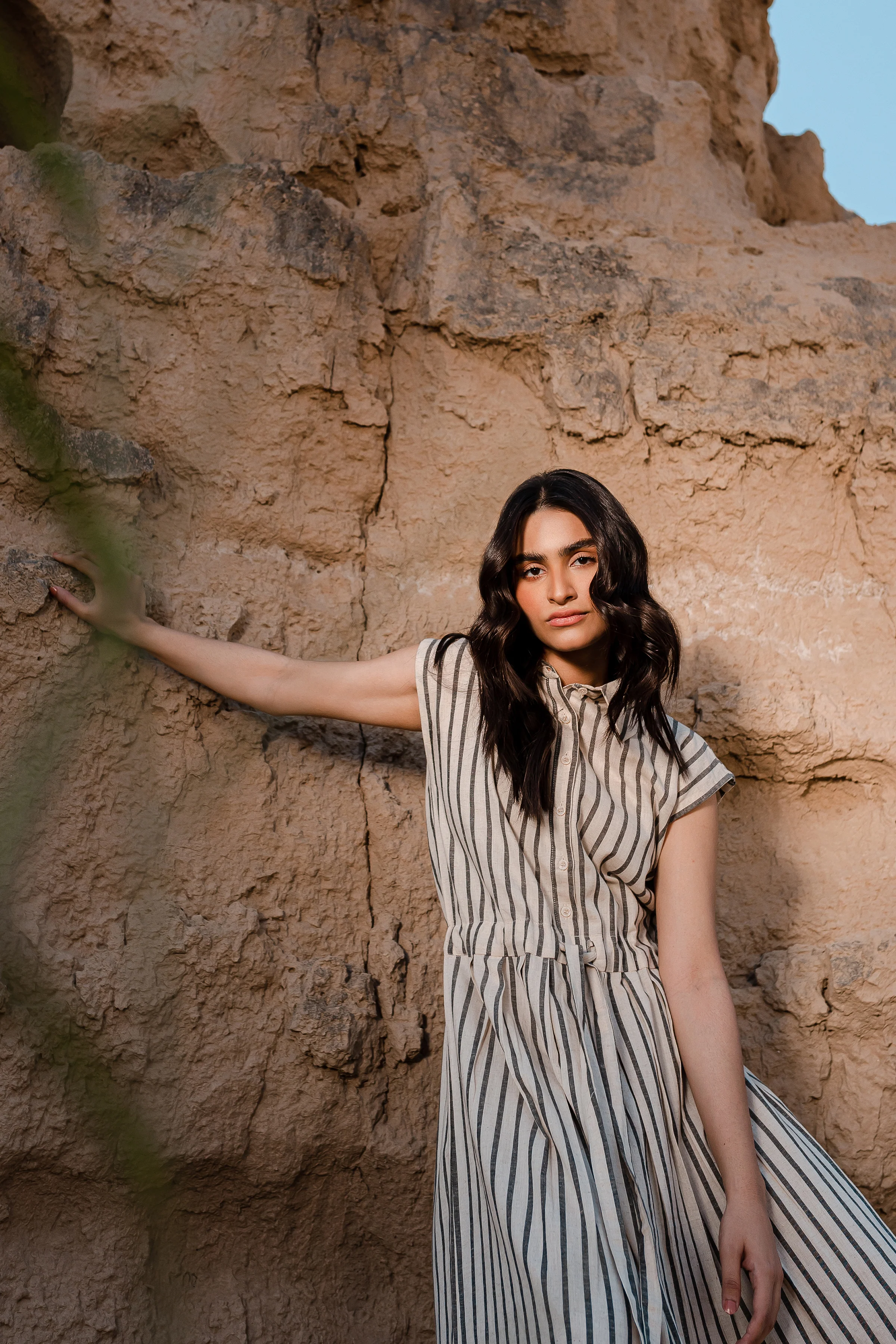 Enhance your fashion with our Black & White Drawstring Dress, a sleeveless collared midi dress crafted from 100% Cotton Linen for ultimate comfort. This dress stands out with its unique design, featuring button tabs on the shoulders for added flair. The dress is designed with belt loops and pareo-style layered details in the same fabric, complete with adjustable ties. The button-up front adds a touch of sophistication.