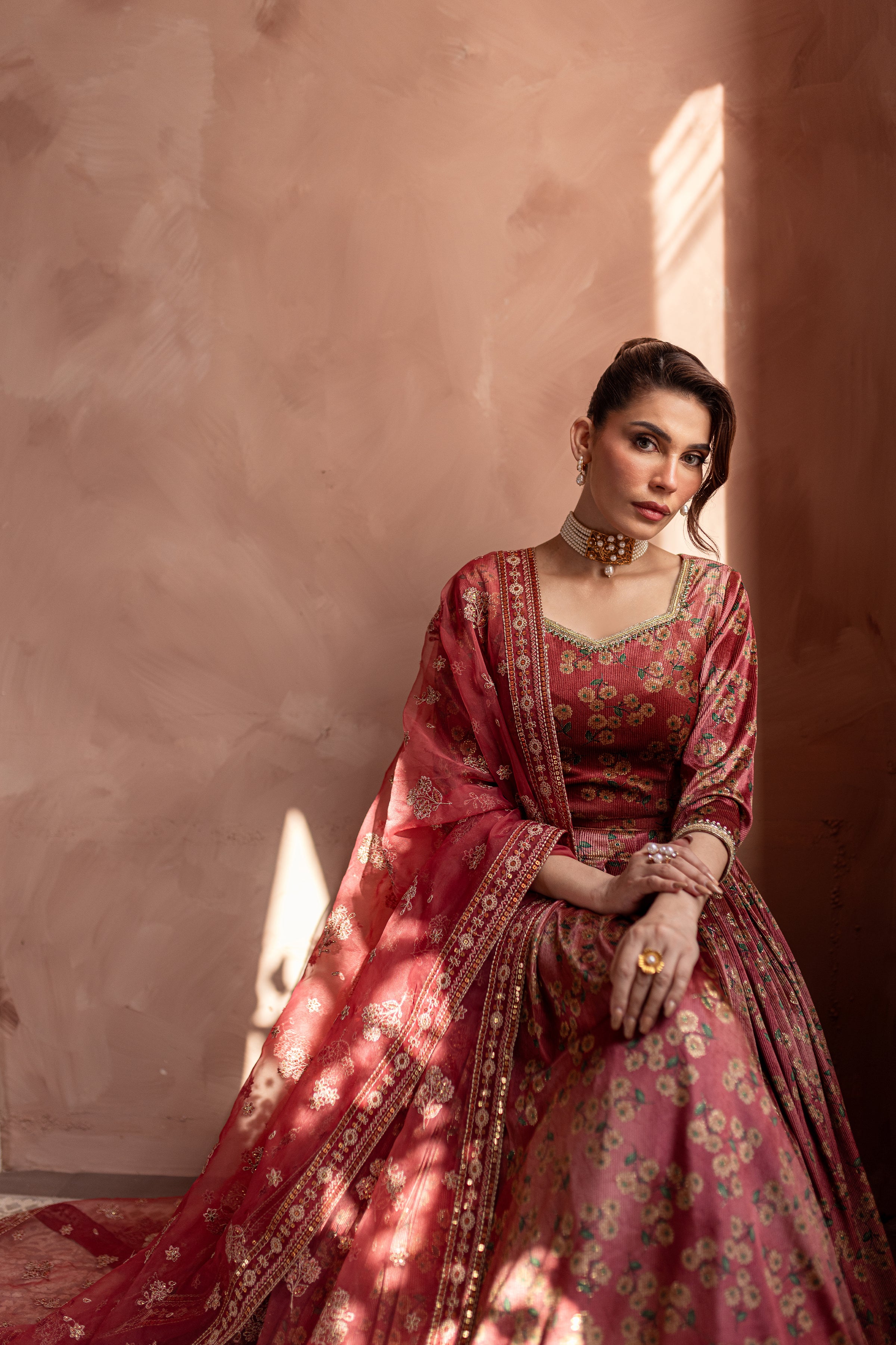 Enhanced with an embroidered organza dupatta having borders on all four sides.