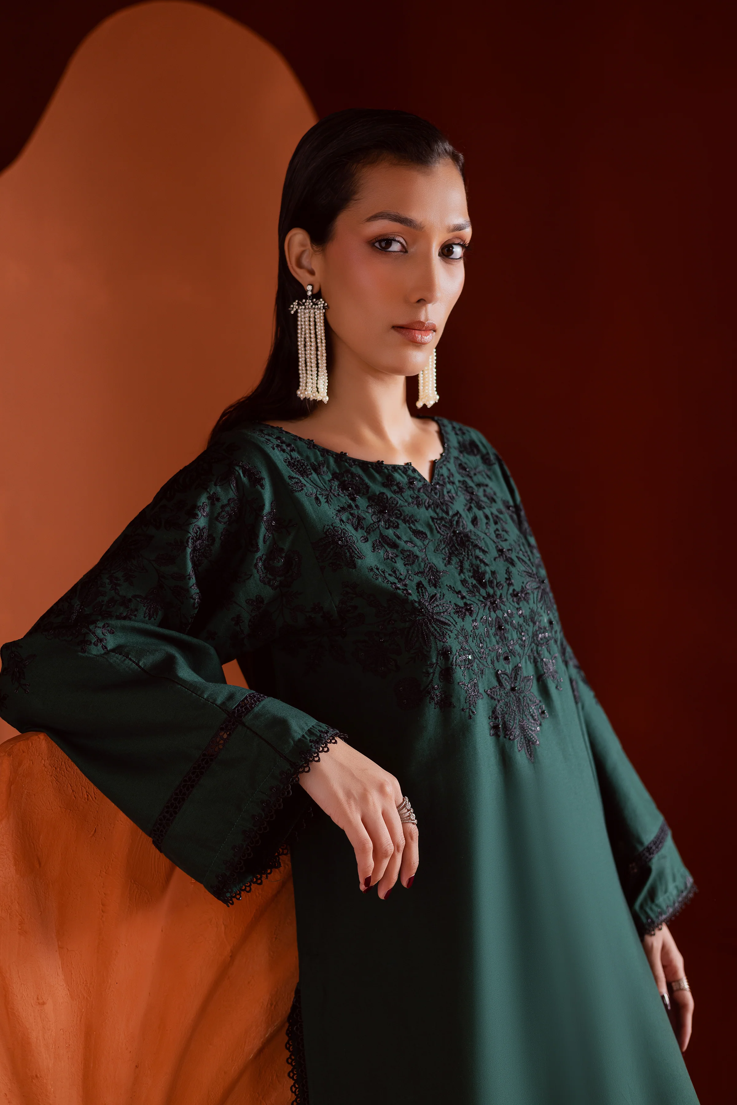 Elevate your style with the Dippit two-piece set, featuring an emerald green kurta-cut short khaddar shirt adorned with contrast black embroidery. The heavily composed neckline and sleeves showcase exquisite hand-embellished details, adding a touch of artistry and elegance.