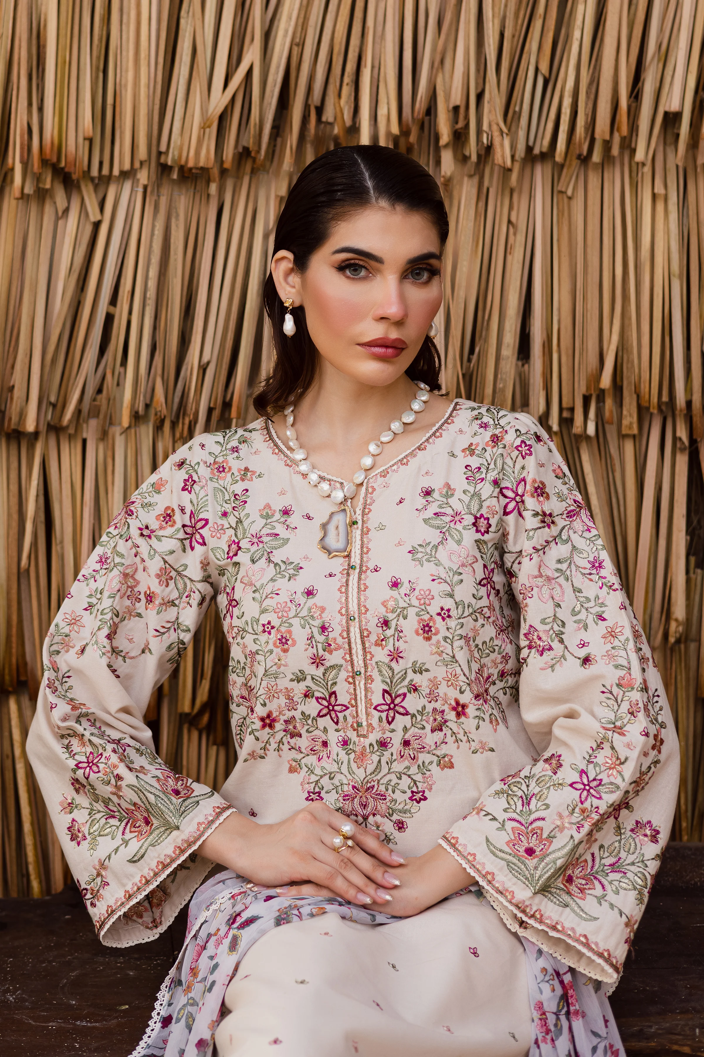 Crafted with finesse, this long khaddar beige shirt features a heavily embroidered neckline adorned with contrasting beads for a striking finish. The composed embroidery spreads across the front, while the heavily embroidered sleeves add richness and depth. It’s a show-stopping piece designed for festive gatherings and formal evenings.