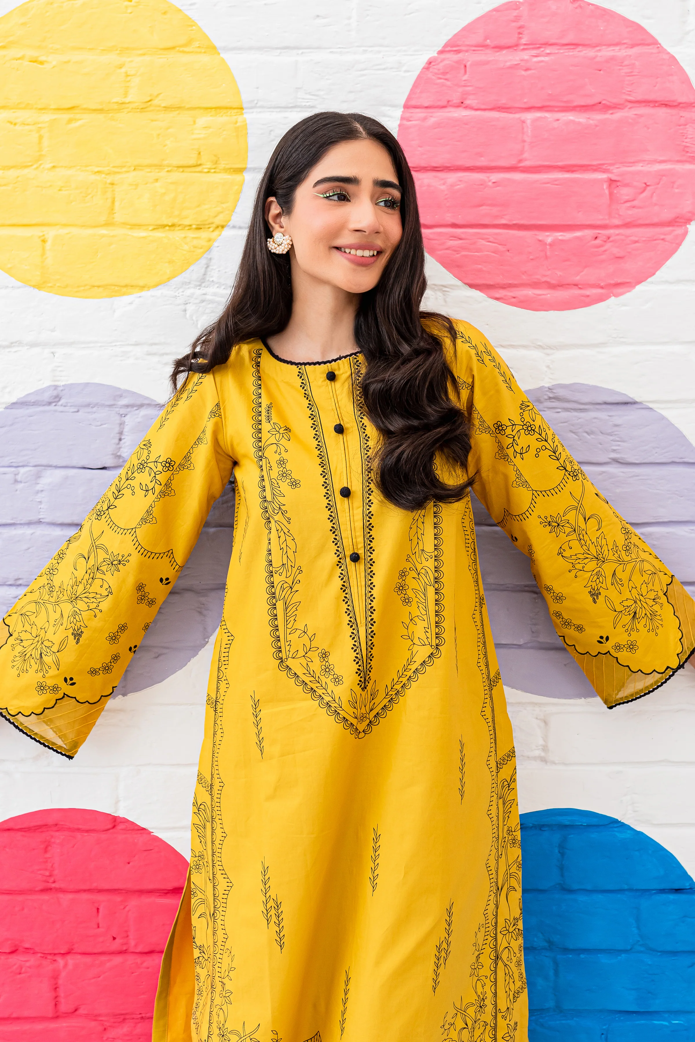 Beautifully designed straight paneled shirt cut from the high quality Cambric in the shades of lime green. Embellishments feature screen prints all over the shirt with added details of buttons at neckline and organza patch work at sleeves