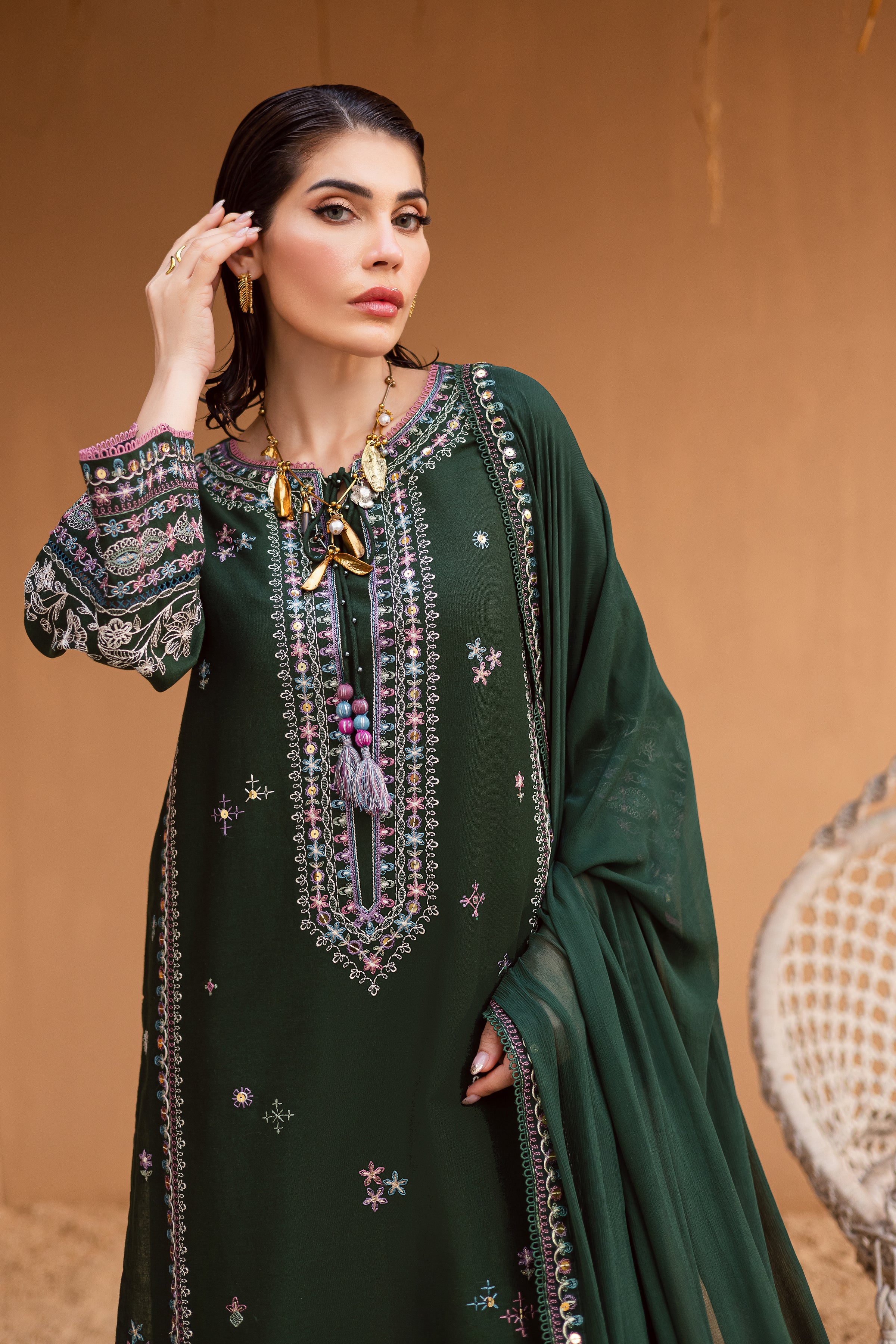 This long, bottle green khaddar heavily embroidered shirt is a masterpiece of craftsmanship, featuring intricate compositions brought to life with 7mm sequins for a subtle shimmer. The neckline is delicately adorned with beads and tassels, while the embroidered sleeves add a graceful finish.