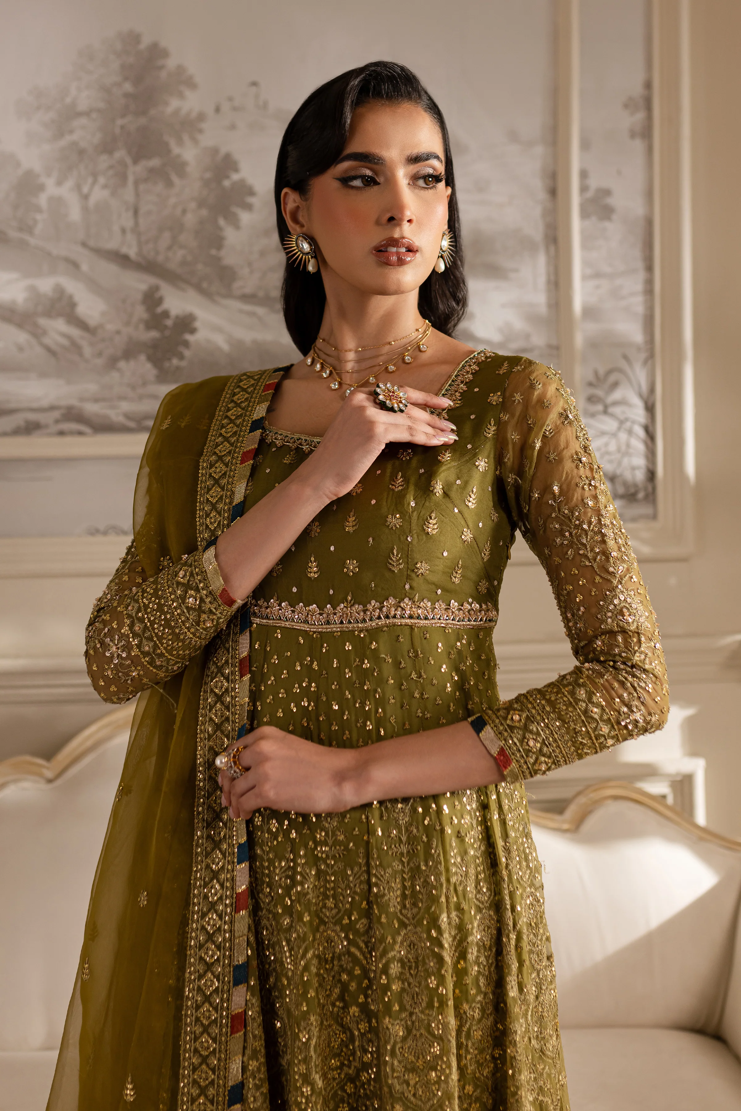 This Crinkle Mehndi Green Crinkle ensemble beautifully blends intricate embroidery with luxurious fabrics. The frock features a heavy embroidered yoke, adorned with direct Adda work on the neckline and yoke hem, adding a touch of intricate craftsmanship. The heavily embroidered sleeves are finished with a delicate embroidered Chatta Patti, enhancing the elegance of the design. The heavily embroidered panels create a beautiful flow, while the border at the hem adds balance to the overall look. The frock is finished with Chatta Patti, adding a refined and polished touch.
